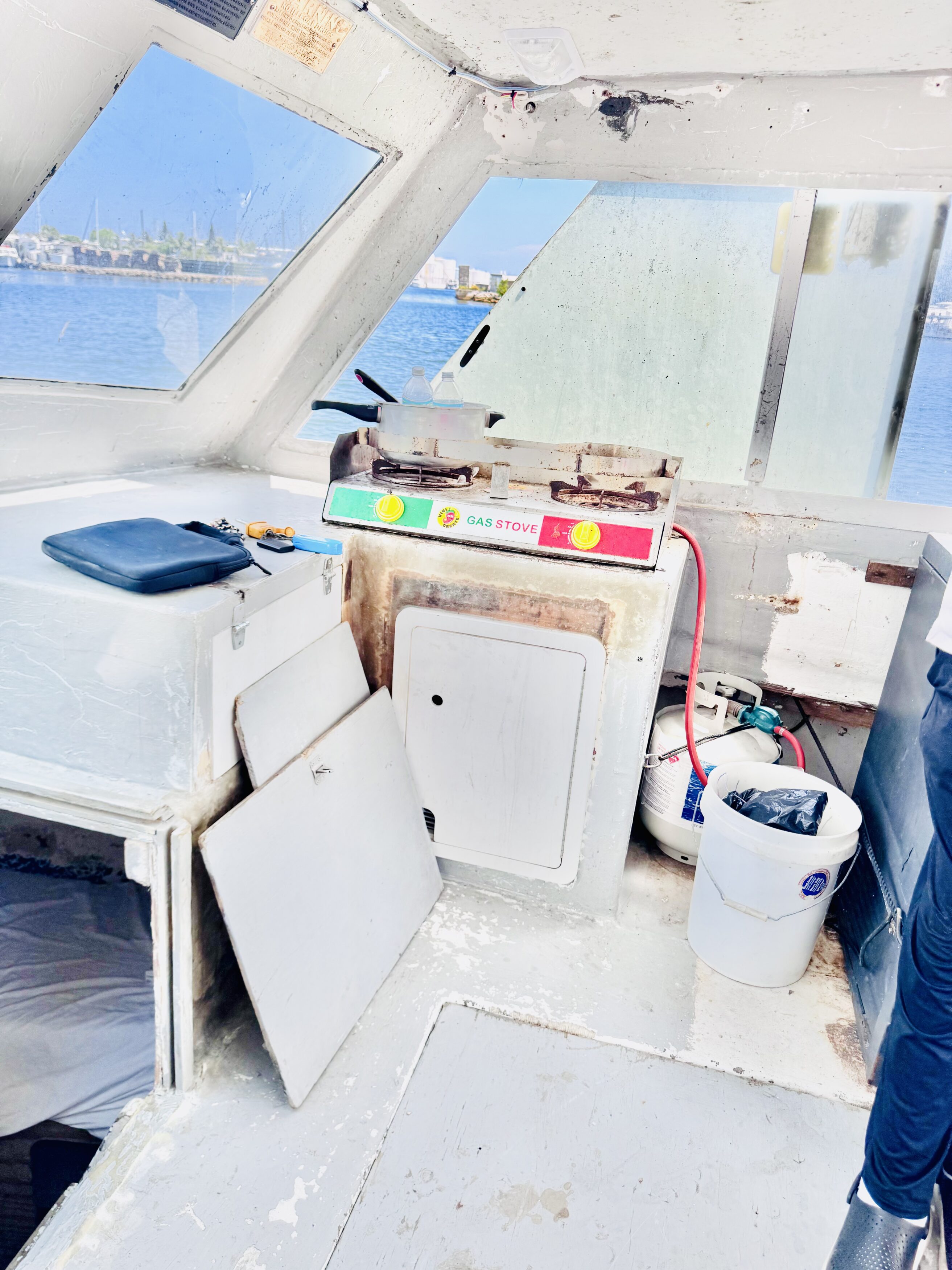 Fiberglass. Diesel fuel. 3 large freezers. Cabin with two small twin size beds. Small kitchen area to cook. New air conditioning unit! The engine has been upgraded along with routine maintenance, and a refurbished dash board area.