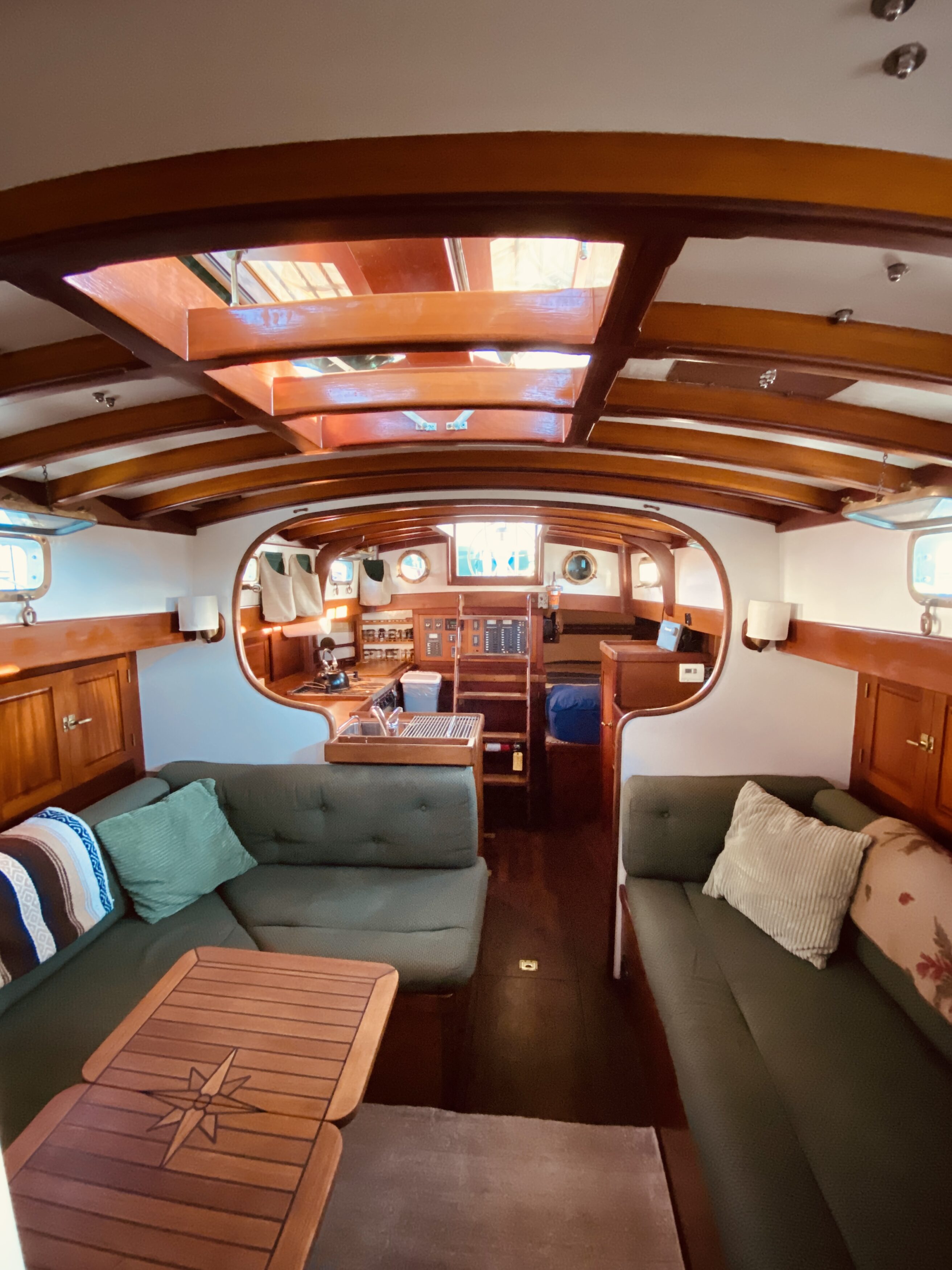 In addition to her proven capability on the water, “On 3” exemplifies the attractive characteristics of this classic sailboat model, complete with stunning features such as solid bronze opening portlights, butterfly hatch over salon, gorgeous brightwork, and aesthetic embellishments like the finishing cabinetry and wooden ceiling beams – all add to the character and charm of this vessel.